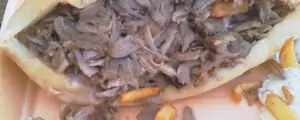 Je met le tout dans une assiette, avec mes frites, et de la sauce algérienne (achetée chez Franprix ! Il ont également de la sauce marocaine, et de la sauce samouraï ).