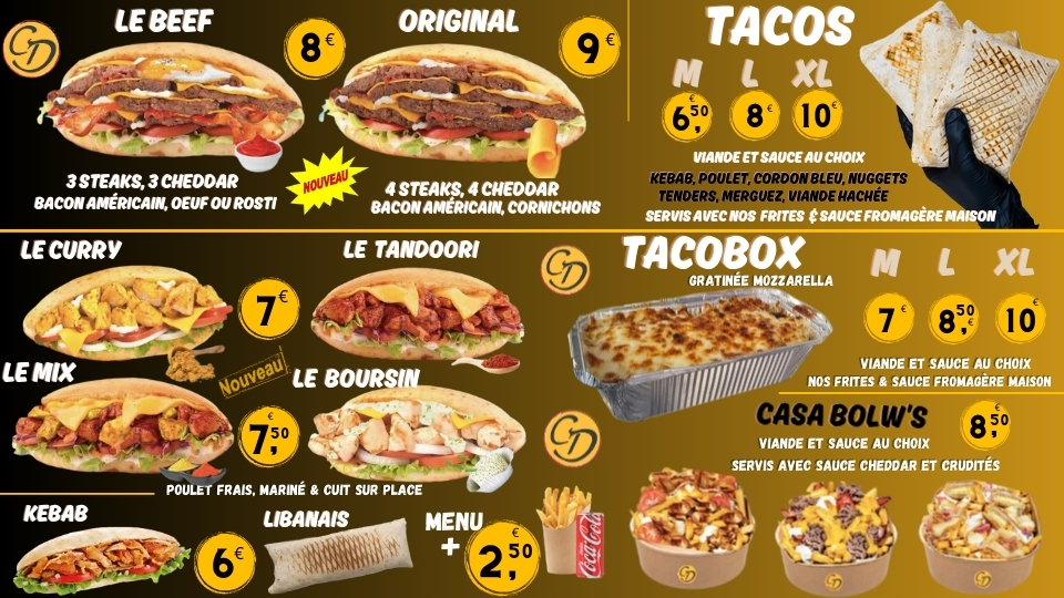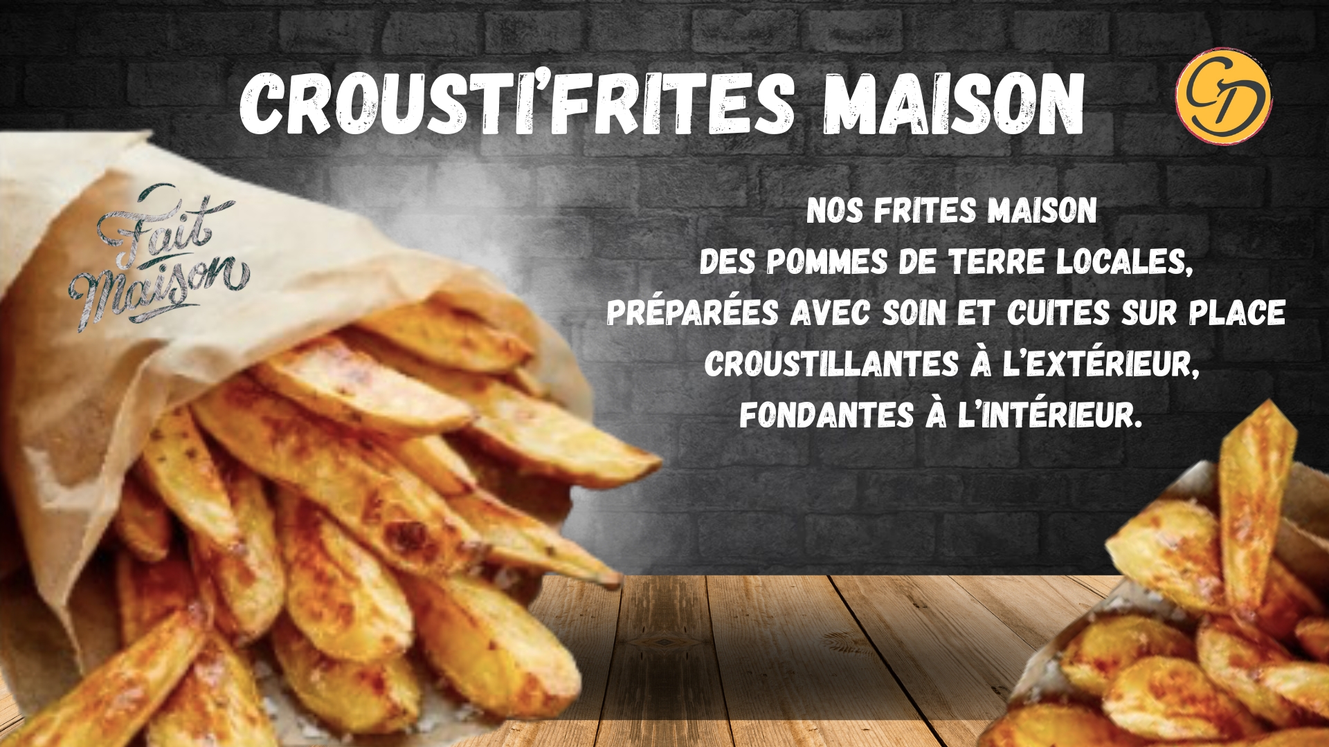 Découvrez un univers gourmand où saveurs authentiques et qualité maison se rencontrent. Savourez nos pizzas à pâte maison, nos pains , nos frites maison croustillantes et une large sélection de burgers, sandwiches, tacos et bowls.