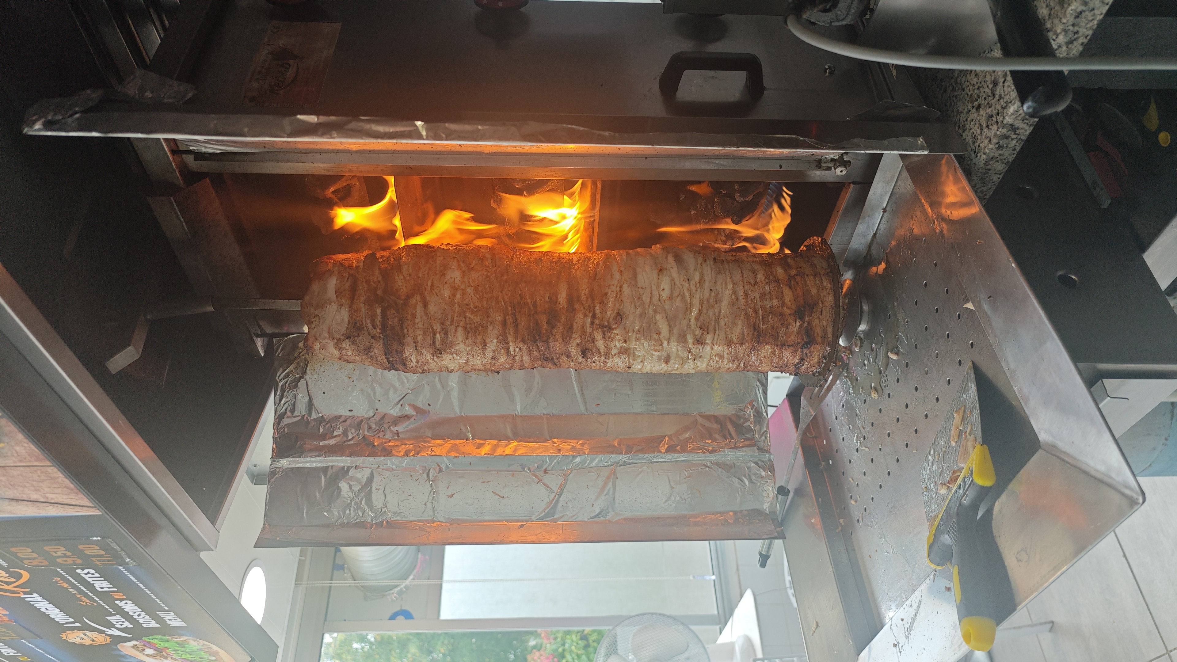 La viande de kebab est cuite au feu de bois.( Unique dans le Calvados)